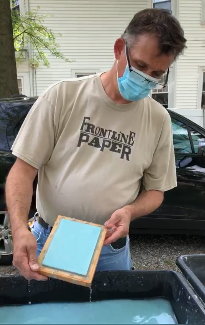 By the beginning of May (kicked off with our #GivingTuesdayNow campaign), our veteran instructors and program and studio managers Ron Erickson and Walt Nygard were making socially-distanced paper in their backyards, in the early epicenter of the outbreak in Teaneck, N.J. We used initial donations of formerly-worn scrubs from Laura Harvey, an RN in Phillipsburg, N.J., and also from Mary Bohrer, longtime member, former board member, and the wife of a medical doctor in Somerset, N.J.